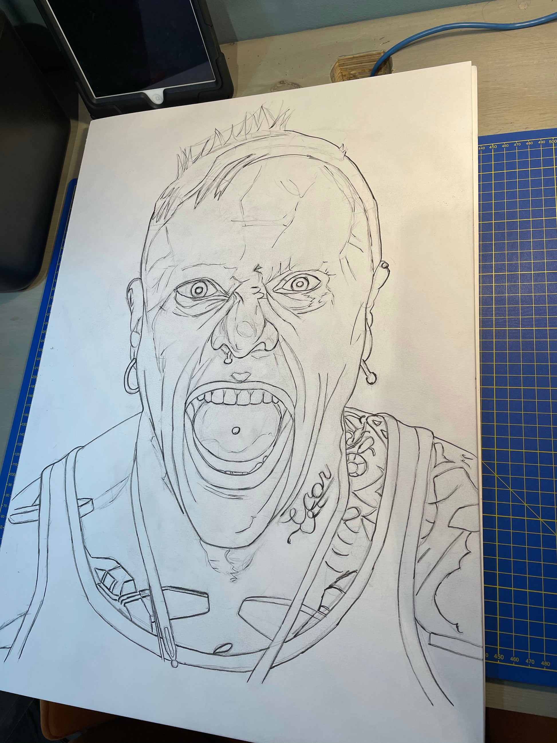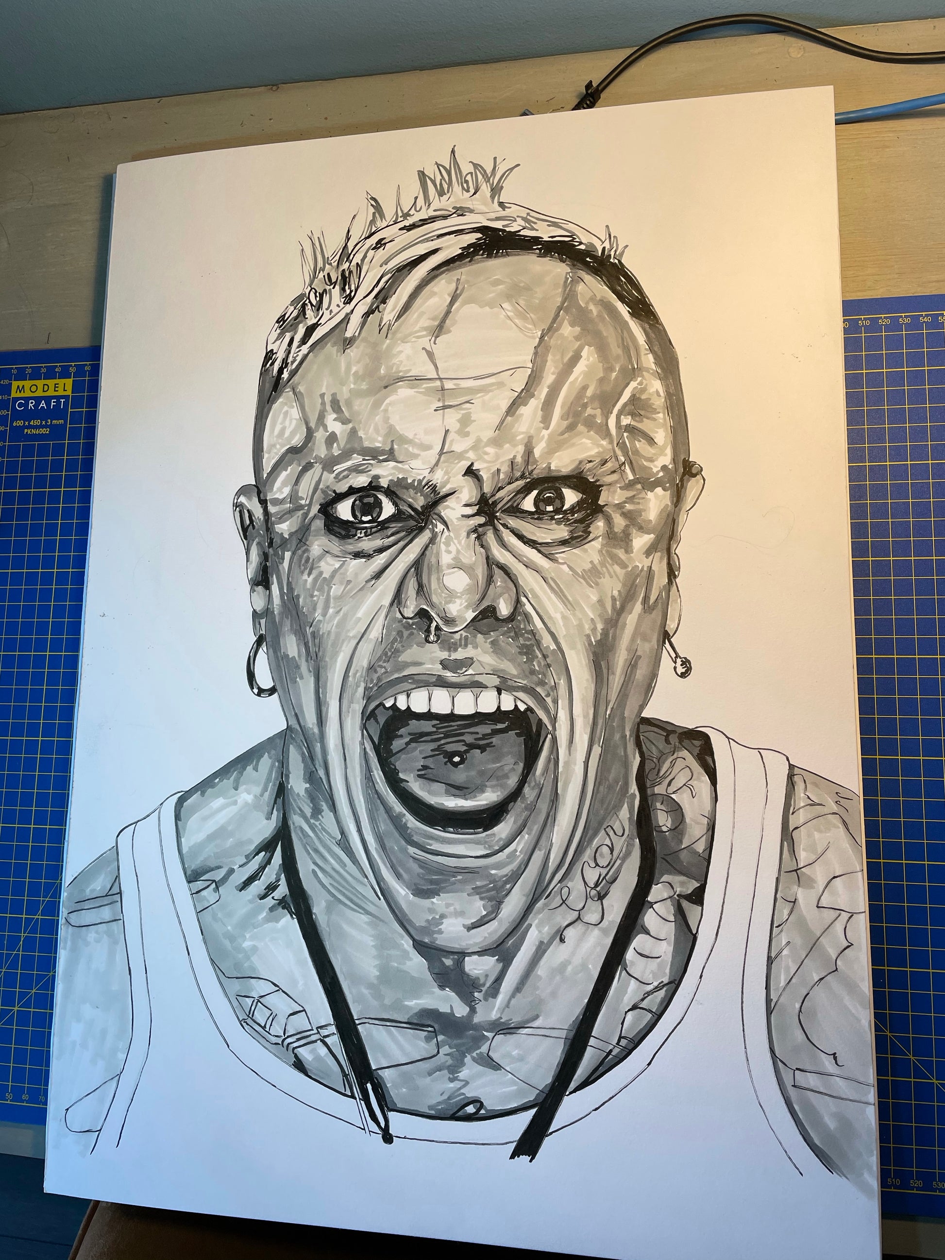Keith Flint was a legend of our era, a firebug with bundles of energy. I NEEDED to give this art all the FLARE I could. I grabbed my pencil, sourced a suitable reference pic and turned up the vibe.