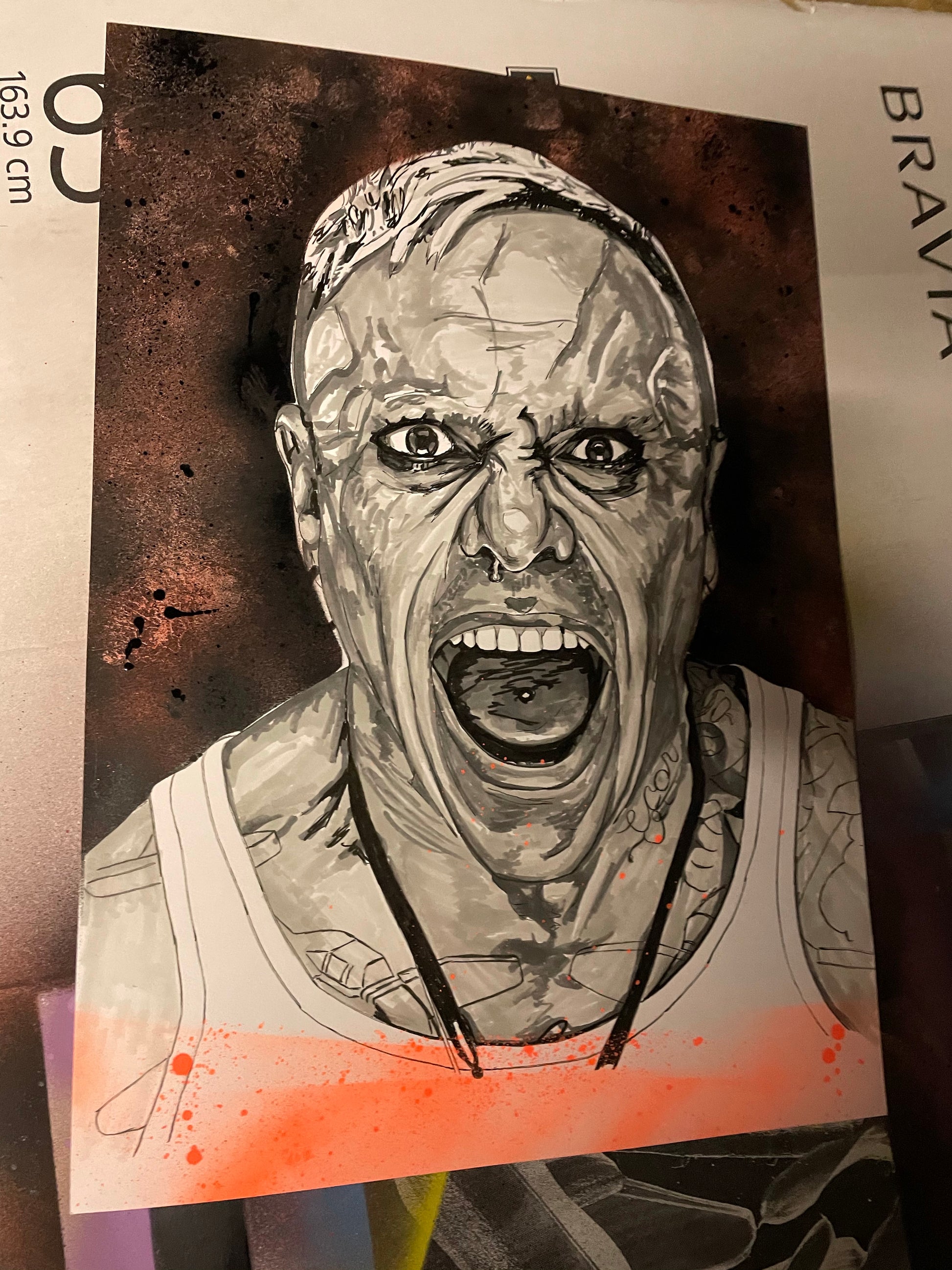 As always catch the process below (in the massively sped up YouTube video). I wanted it to be large so it is a full-size A2 image. Sketched the outline, came through with the ink. Then proceeded to layer up the Winsor and Newton shades of grey. Basic colours blotted in, I grabbed my (ORANGE) spray paint and went to town on the background. After that, it was just a case of the detail. Fineliner back in hand and a good couple of hours bringing the artwork to where I was happy with it.