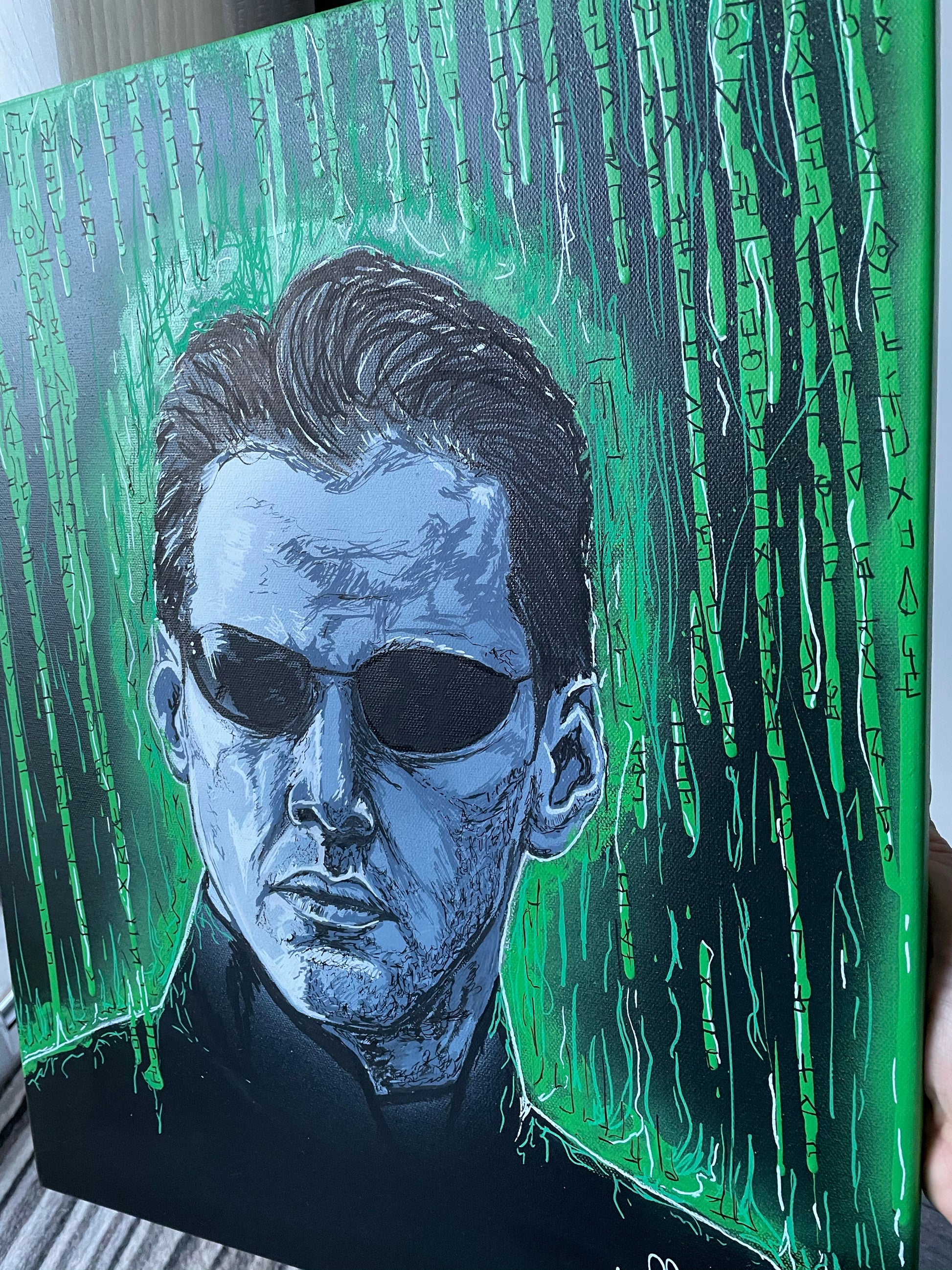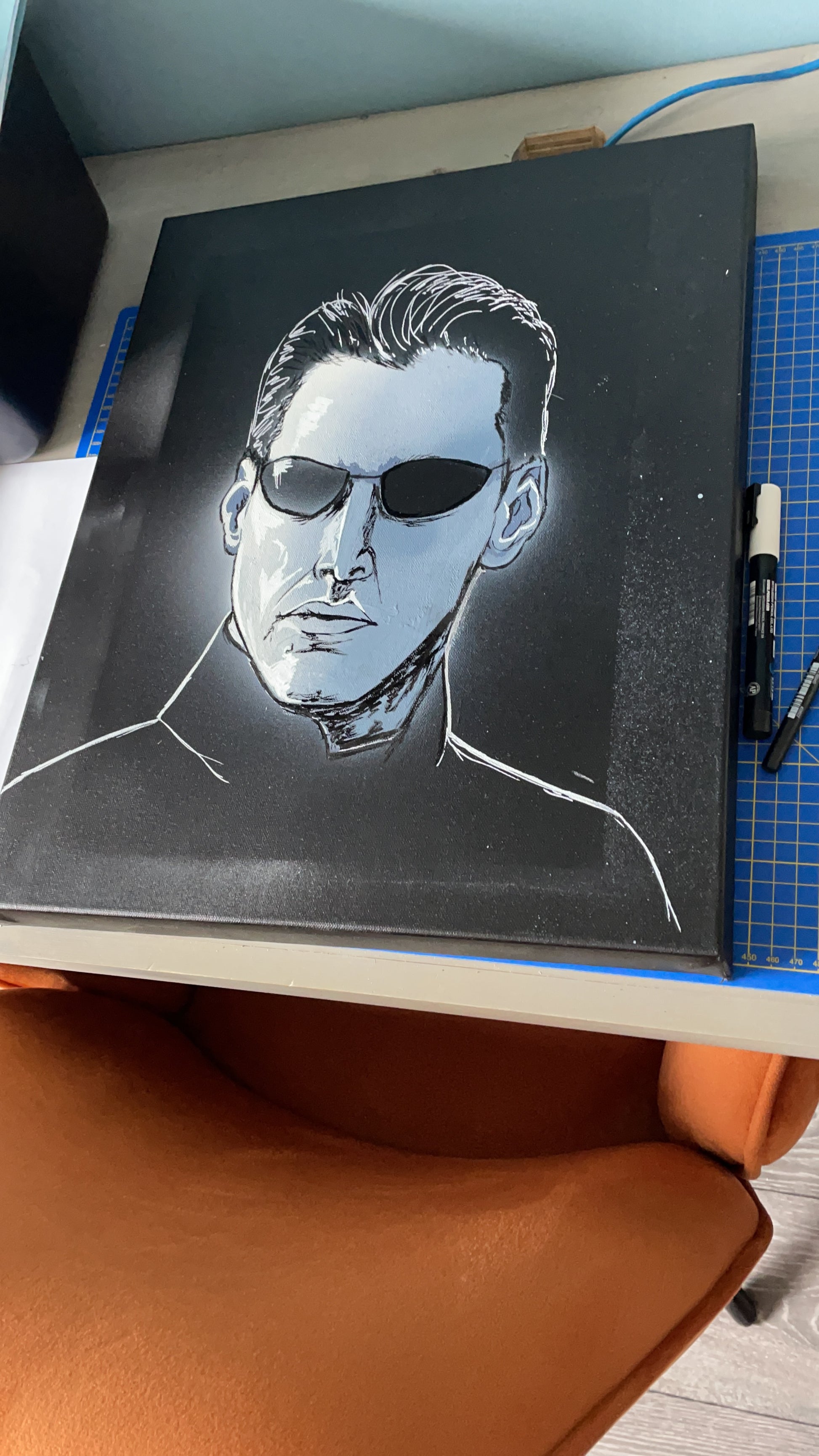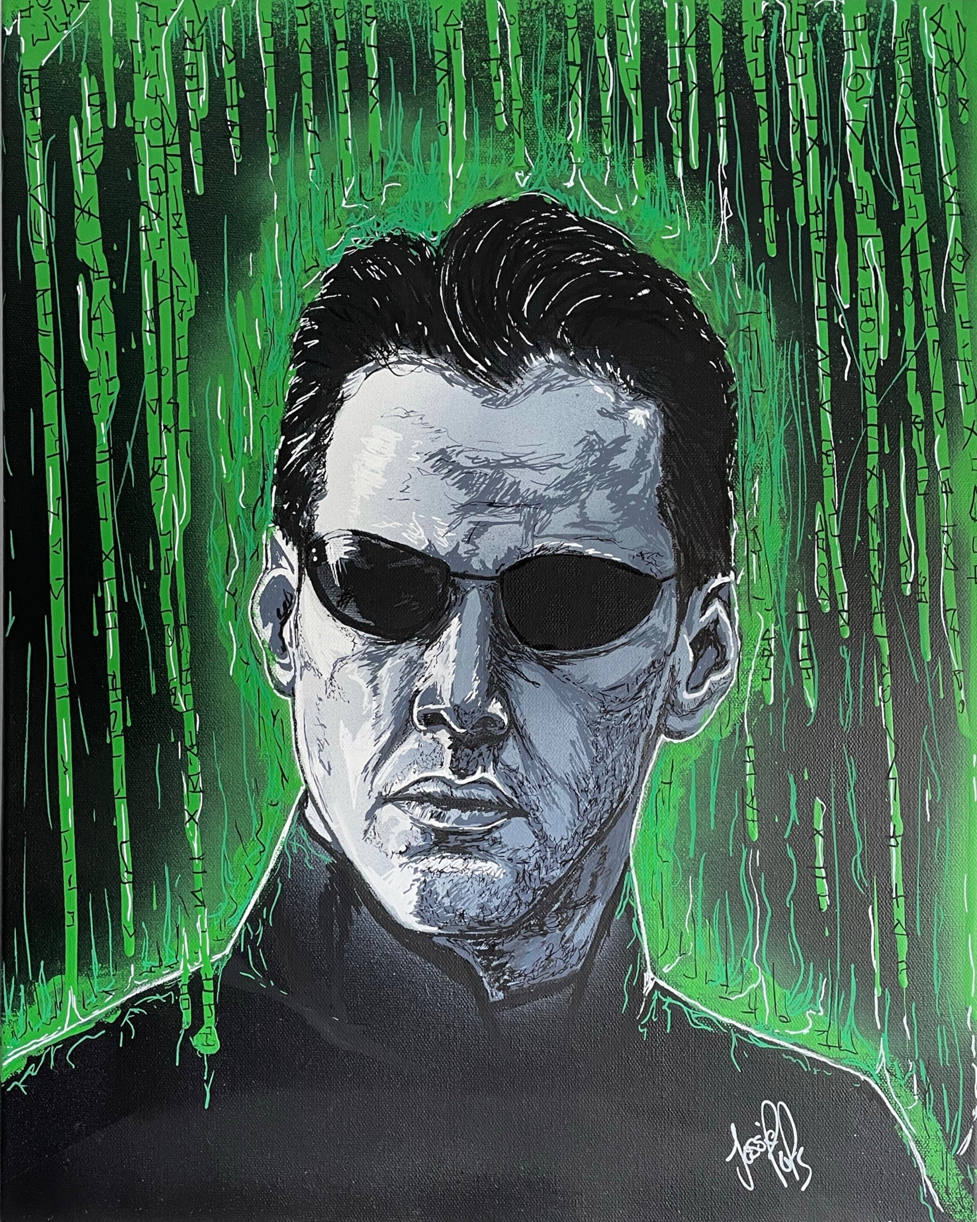 I’m all over that red pill. With this one I wanted to create the GREEN paint through Neo and the Matrix. Starting with a black blank canvas and after sketching out my intention, I sprayed the white face of our hero. Next up building up the detail with ink until finishing it off at the end with the matrix code dripping down the background.