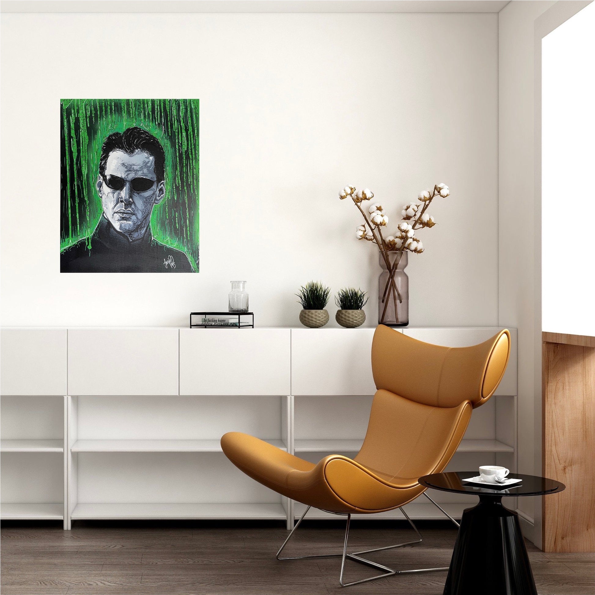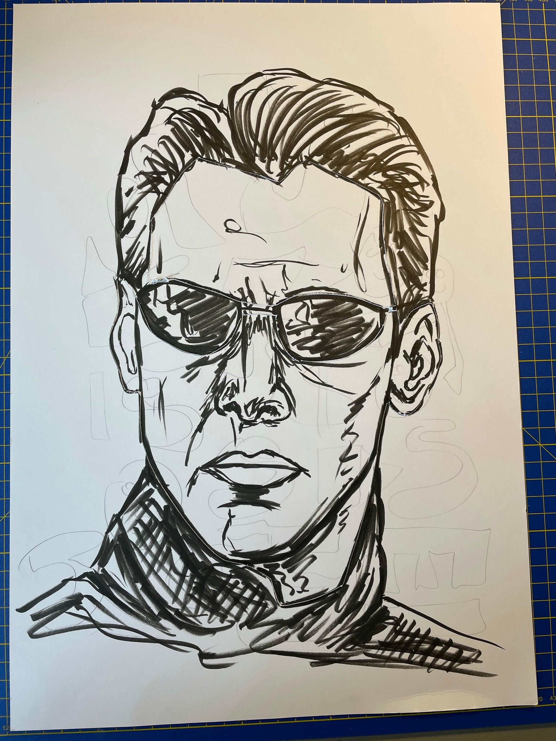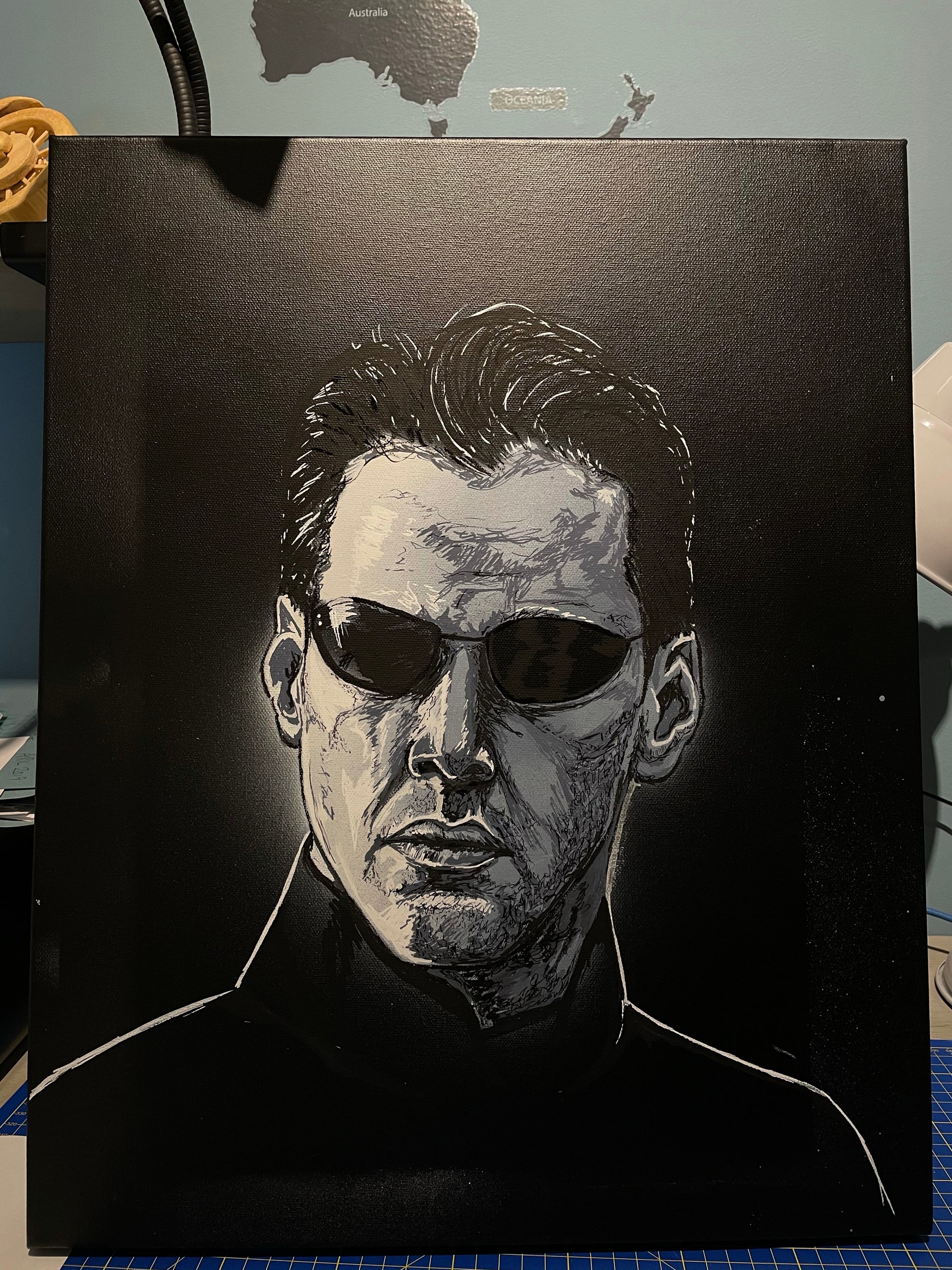 I’m all over that red pill. With this one I wanted to create the GREEN paint through Neo and the Matrix. Starting with a black blank canvas and after sketching out my intention, I sprayed the white face of our hero. Next up building up the detail with ink until finishing it off at the end with the matrix code dripping down the background.
