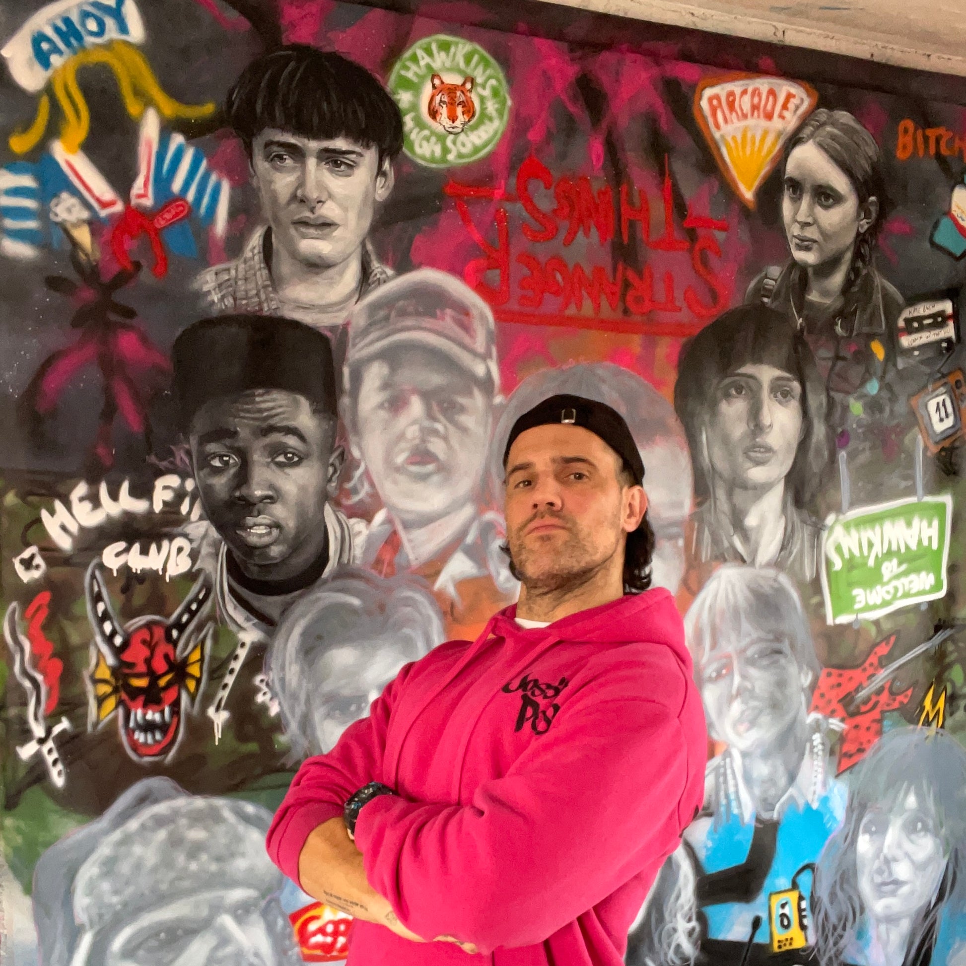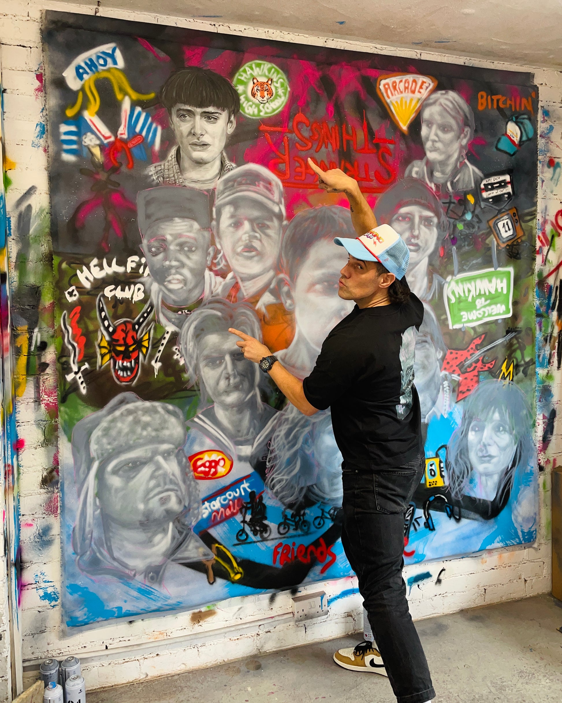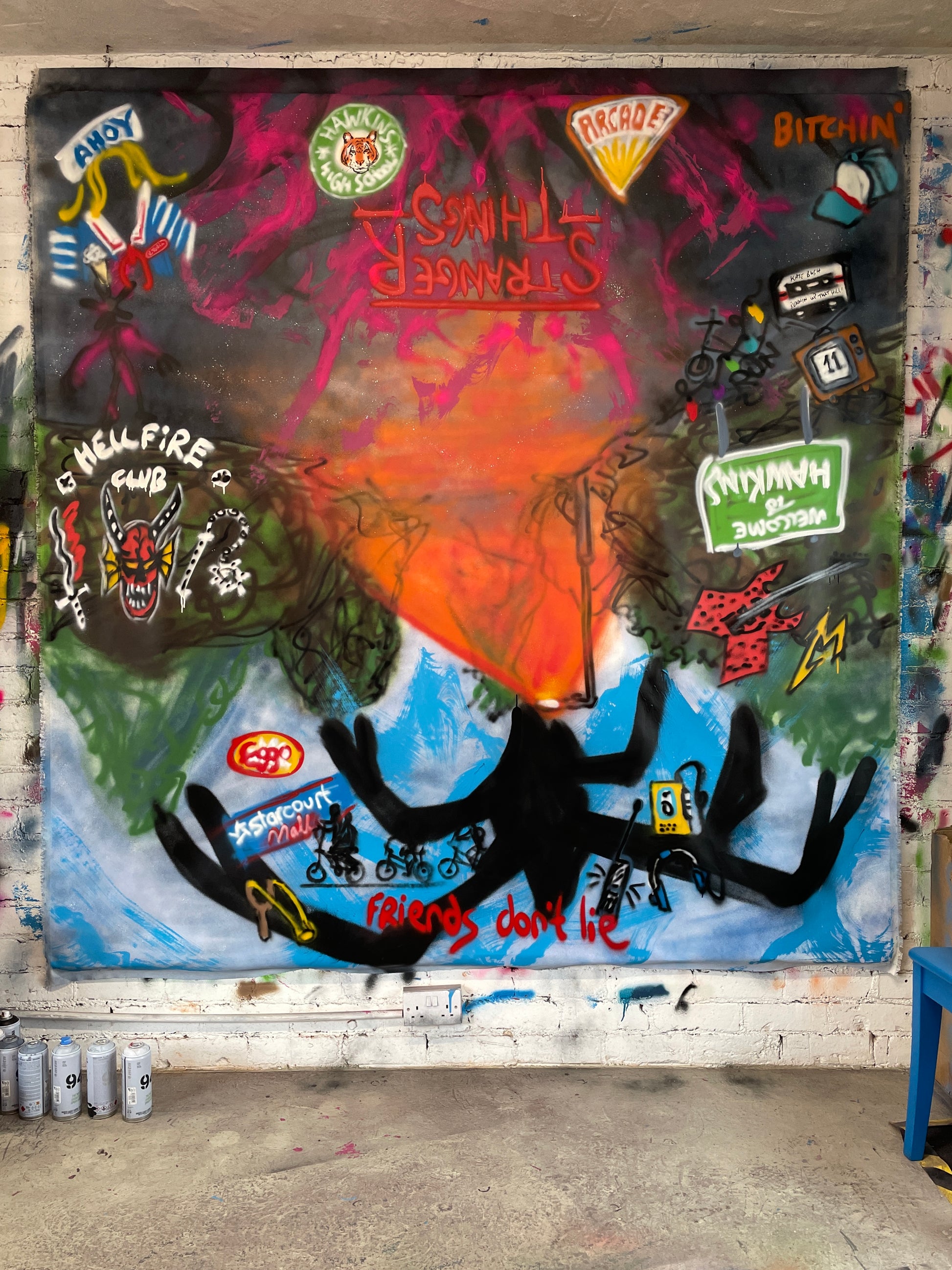 "I’m working on a 2m x 2m commission piece that’s all about the world of Hawkins. It’s packed with 11 heads from the show, each one layered into this huge, atmospheric Stranger Things background. Of course 11 is taking the front and centre, but there was way to many key characters on this show to only draw a couple. The scale lets me really play with the detail – faces, shadows, light – while the backdrop in my usual quirky style pulls it all together with that eerie, otherworldly vibe the series nails so well."