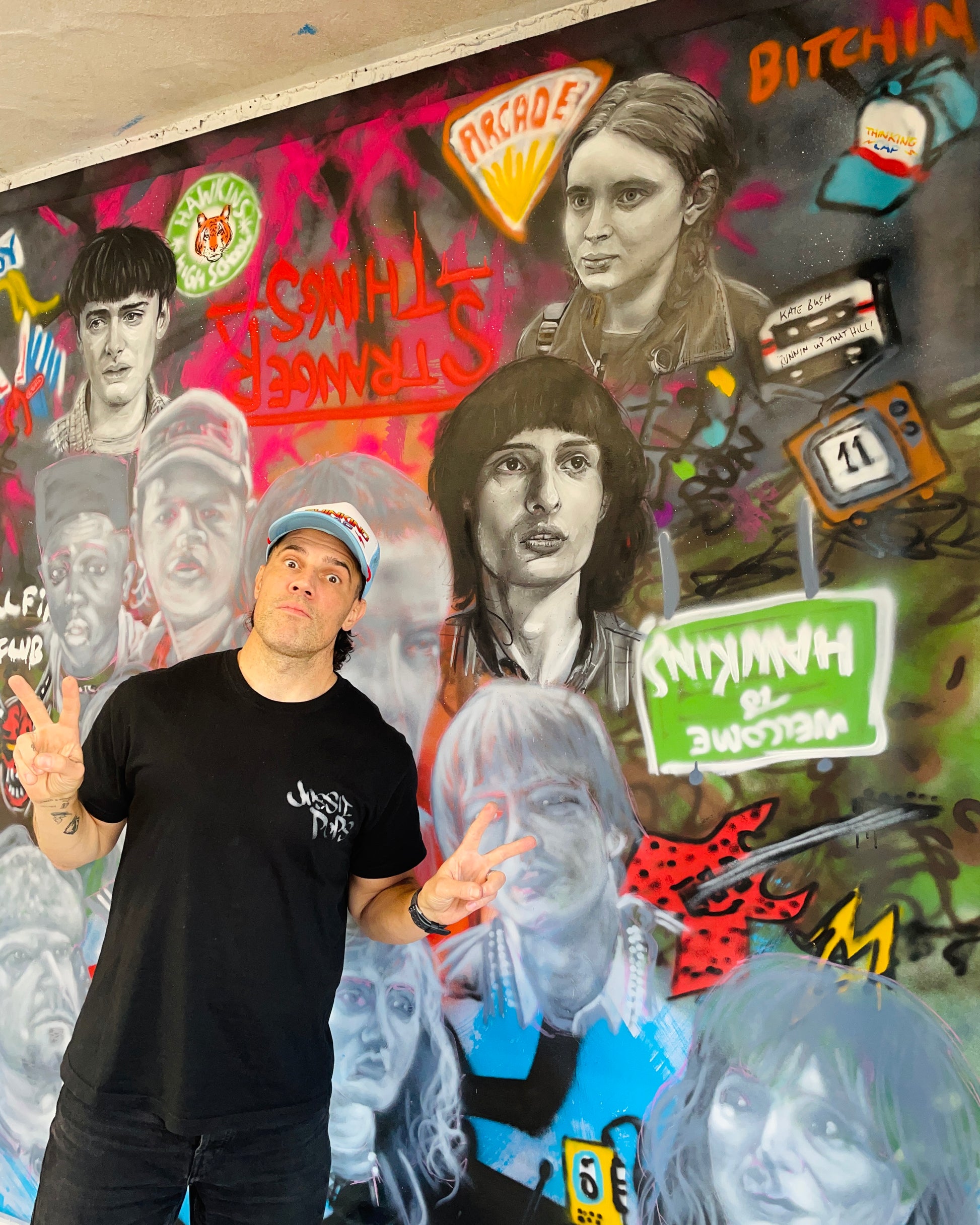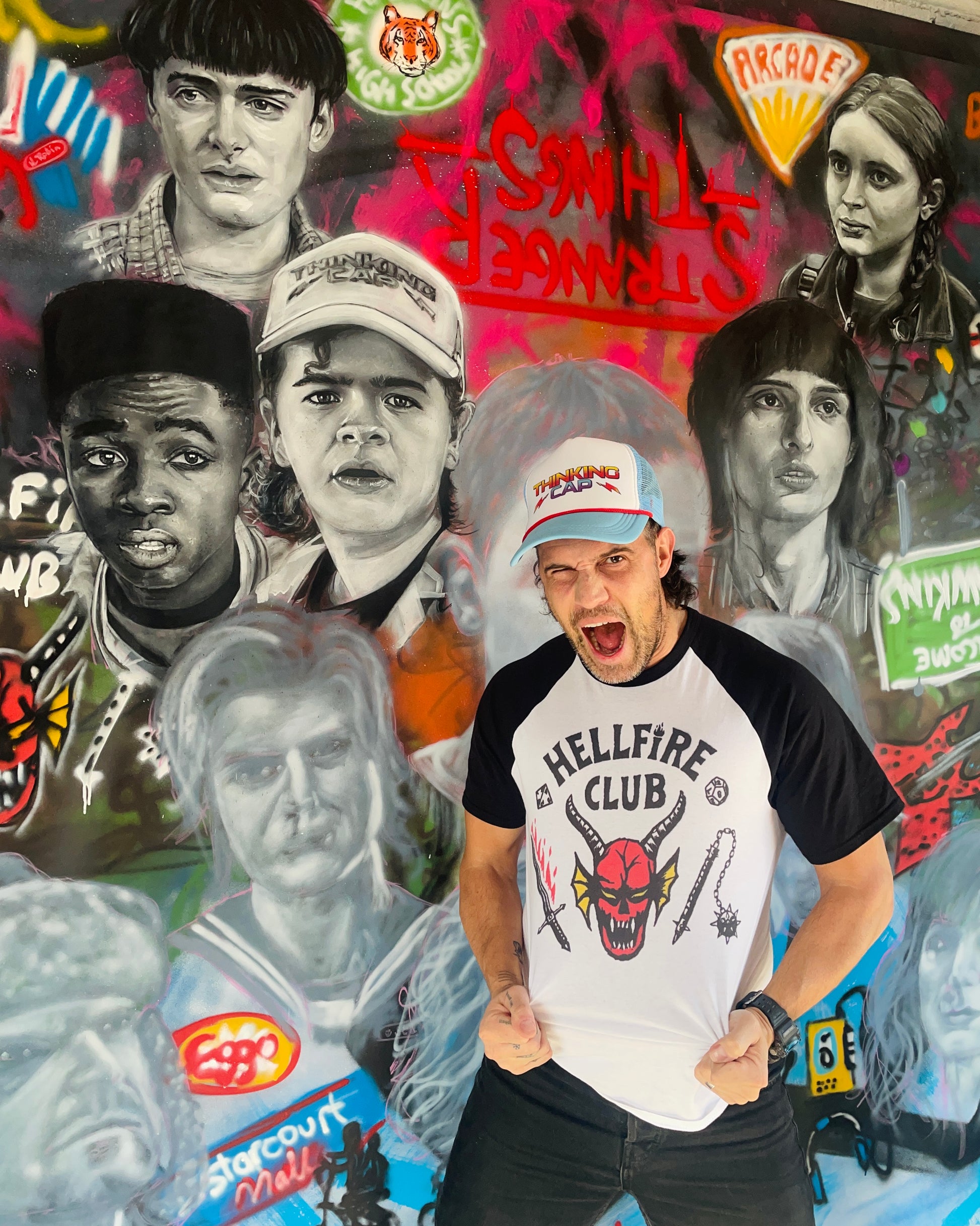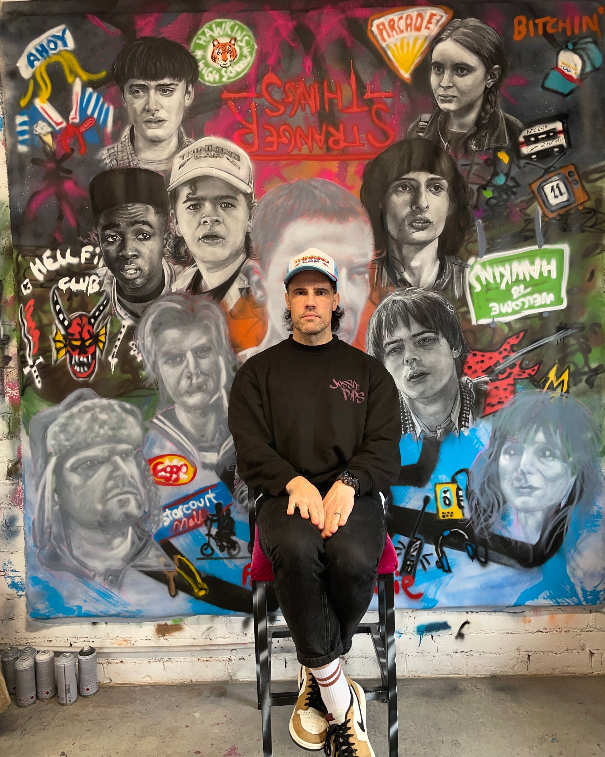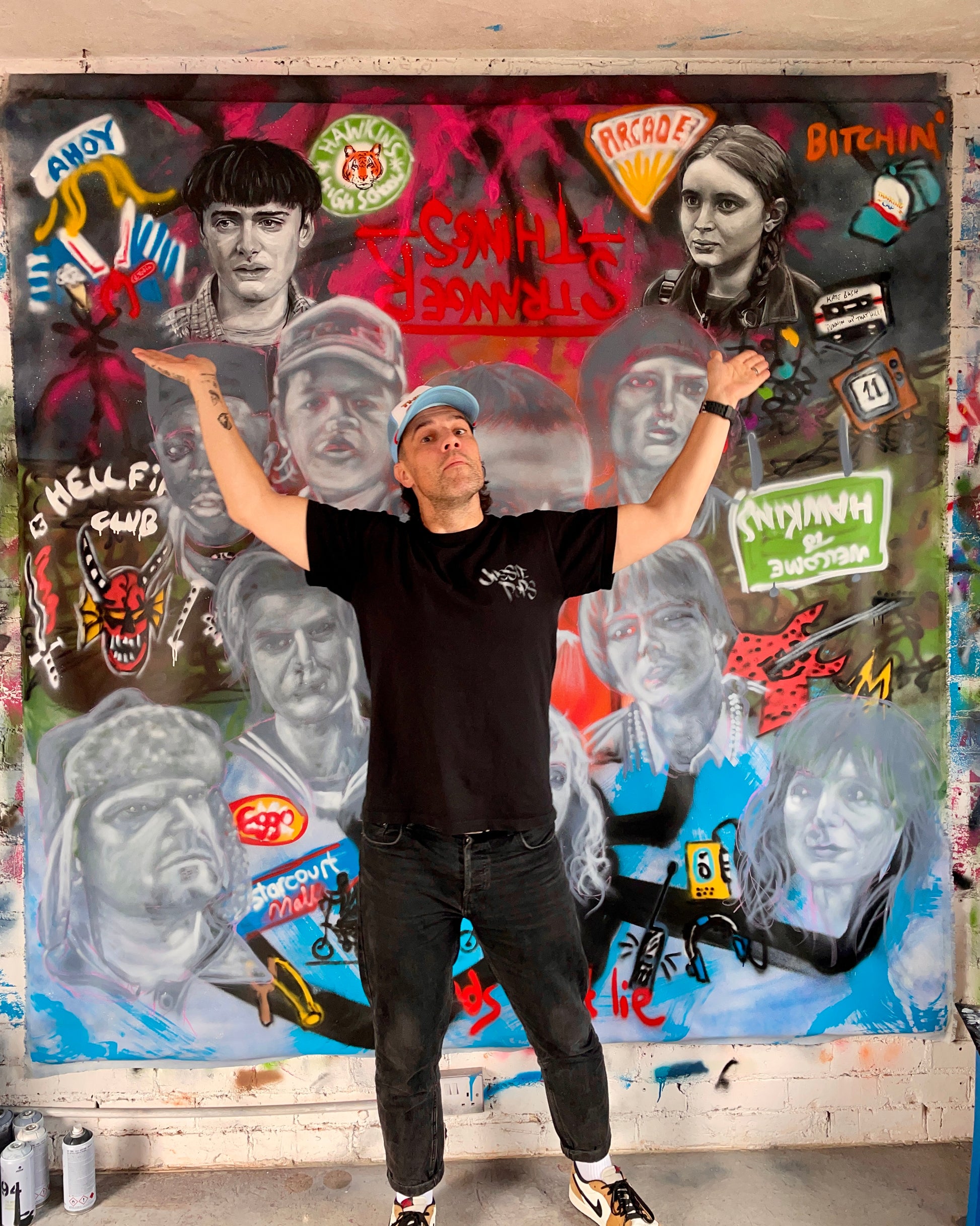 "I’m working on a 2m x 2m commission piece that’s all about the world of Hawkins. It’s packed with 11 heads from the show, each one layered into this huge, atmospheric Stranger Things background. Of course 11 is taking the front and centre, but there was way to many key characters on this show to only draw a couple. The scale lets me really play with the detail – faces, shadows, light – while the backdrop in my usual quirky style pulls it all together with that eerie, otherworldly vibe the series nails so well."