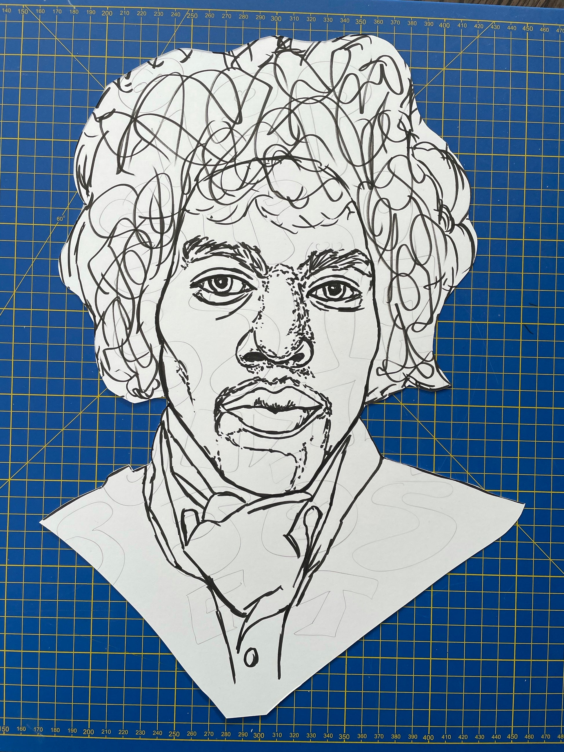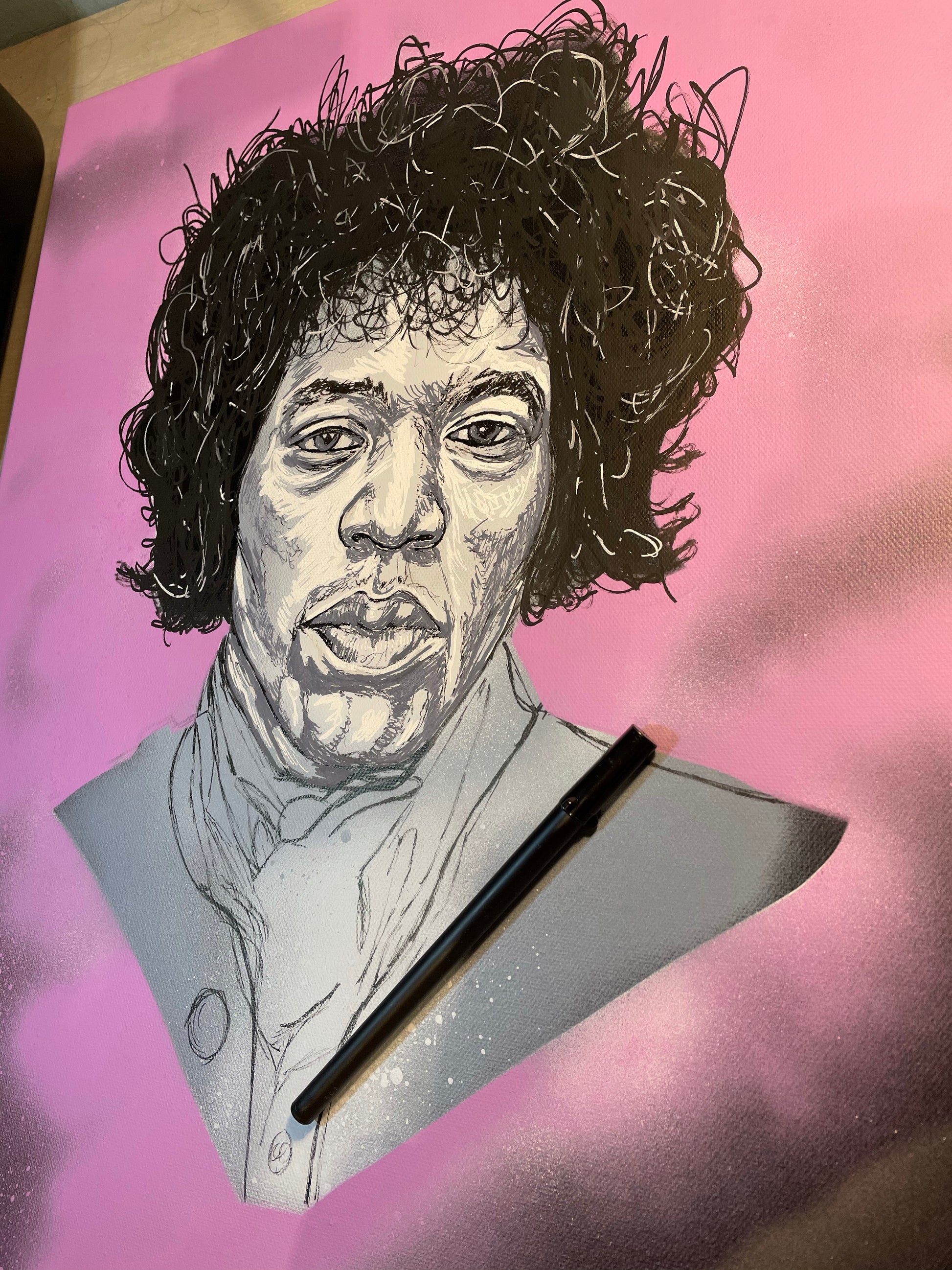 Started with the sketch, I sprayed the deep background black. After that I stencilled the basic shape of Jimi with various shades of grey.