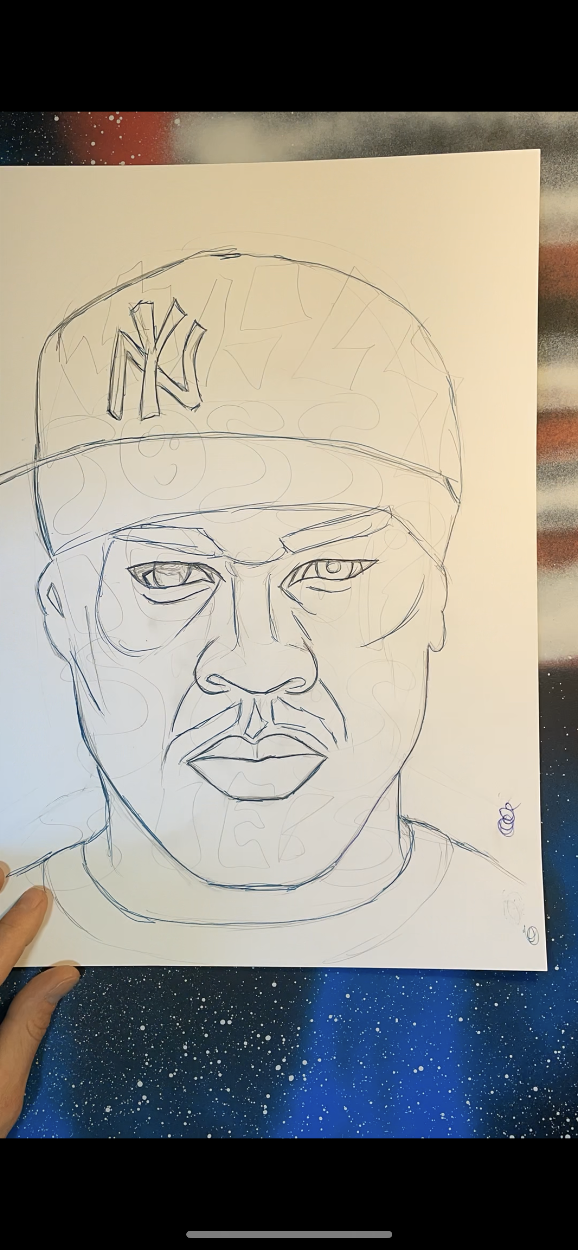 I wanted it to be large so it is a full-size A2 image. Created my background, sketched the outline, transferred the outline to the background. Basic colours blotted in, I wanted the (RED/BLUE) paint from underneath to shine through his cap. After that, it was just a case of the detail. Fineliner back in hand and a good couple of hours bringing the artwork to where I was happy with it.