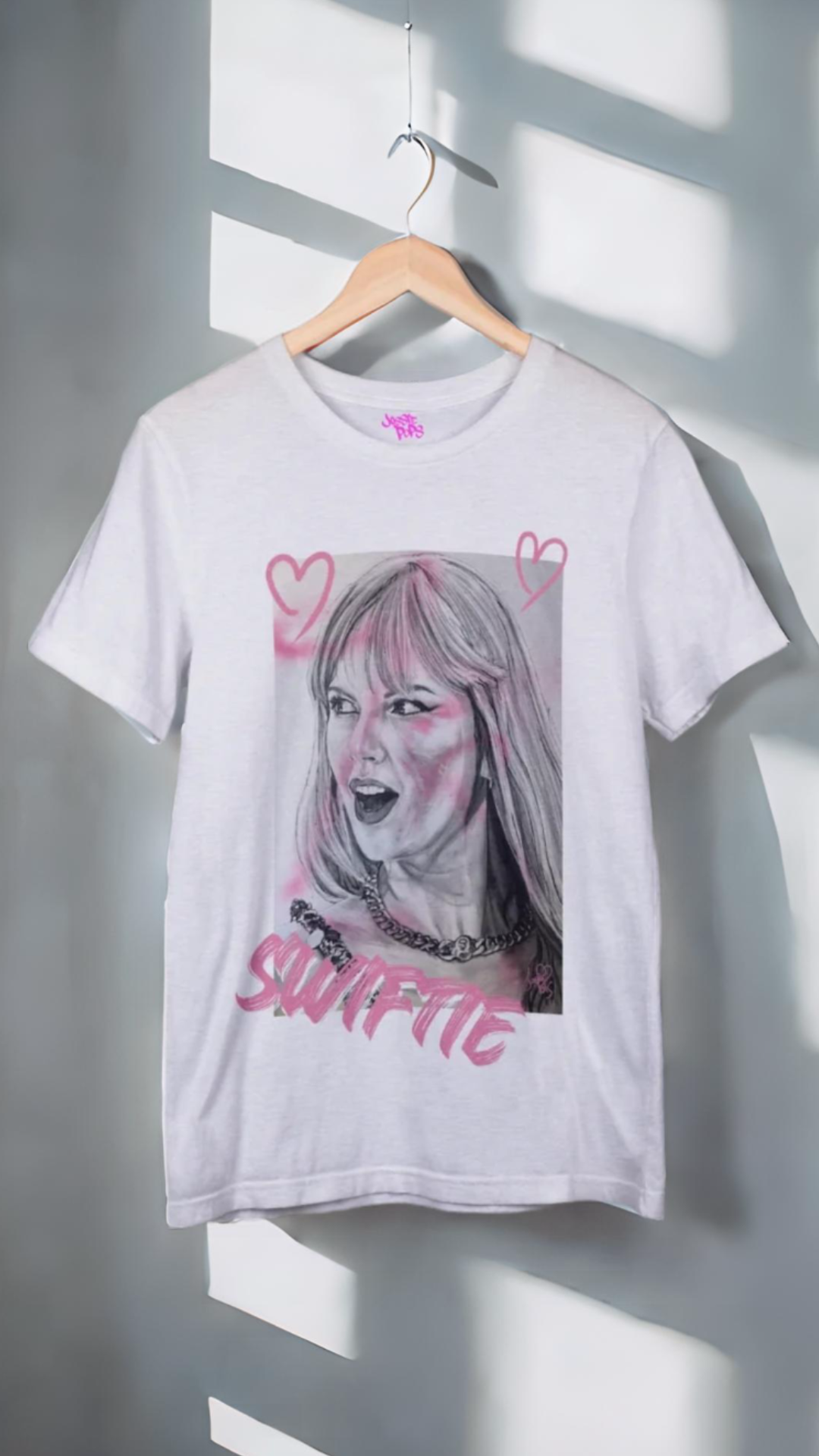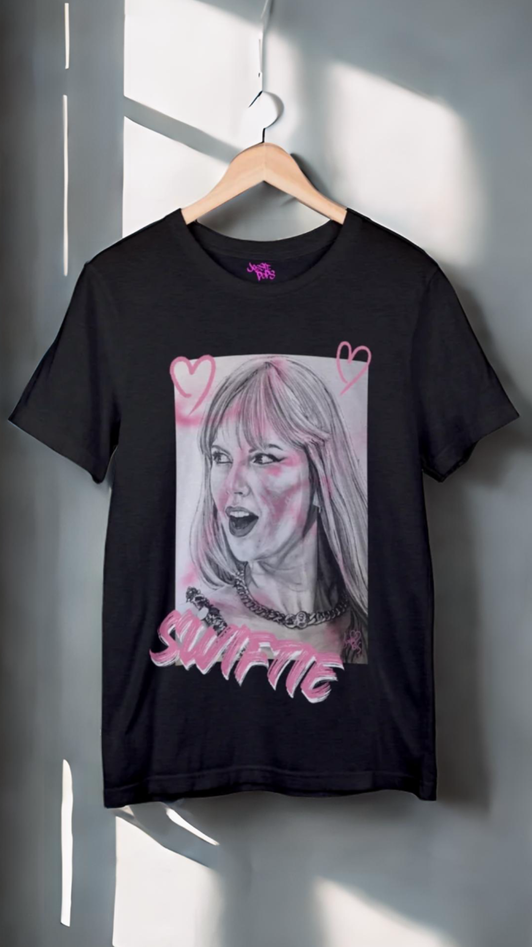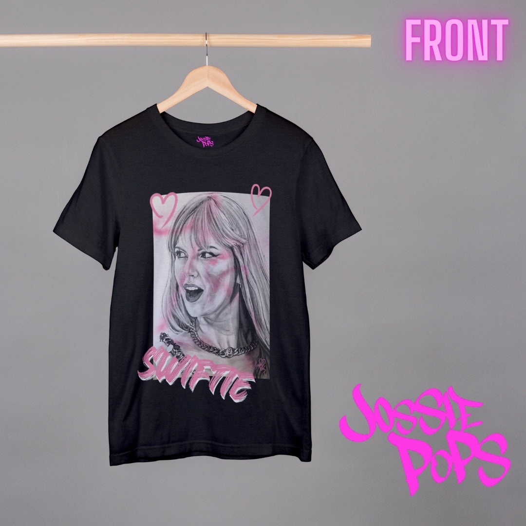 Hey Swifties! Get ready for the era tour with this Taylor Swift T Shirt! Check out the freshest drop from Jossiepops – a slick tee featuring a hand-drawn portrait of the pop queen herself, Taylor Swift! This isn't just any shirt; it's a canvas where music meets street art, all wrapped up in a comfy tee that's perfect for music lovers any day out or a cosy night in. Splashed with vibrant pink accents and playful hearts, it captures Taylor's iconic style and sass. The bold "SWIFTIE" lettering adds just the right amount of fan pride, making it a must-have for anyone looking to show off their love for T-Swizzle in style. Rock it at her next concert or just out and about to spread some Swiftie love wherever you go!